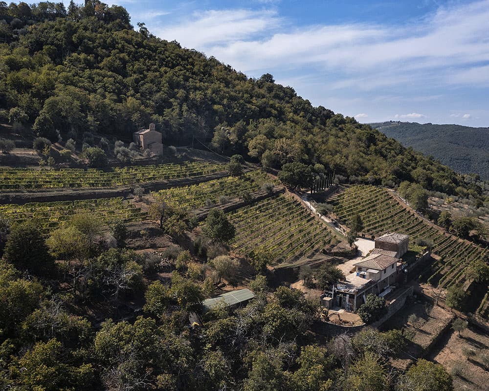 Alessandro Mori is supported in his work by the creative soul of the company, Lucia Nannetti, and the cellar manager Maurizio Valeriani. The management of the vineyards, which occupy only six hectares, is based on a traditional and minimalist philosophy. The plants are influenced as little as possible by human hands and are not treated with herbicides or conventional pesticides. The vines on the almost 400-metre-high slopes of Montosoli, which surround the estate in a continuous manner, are arranged so generously on sandy soils that each plant has sufficient space for good root penetration.